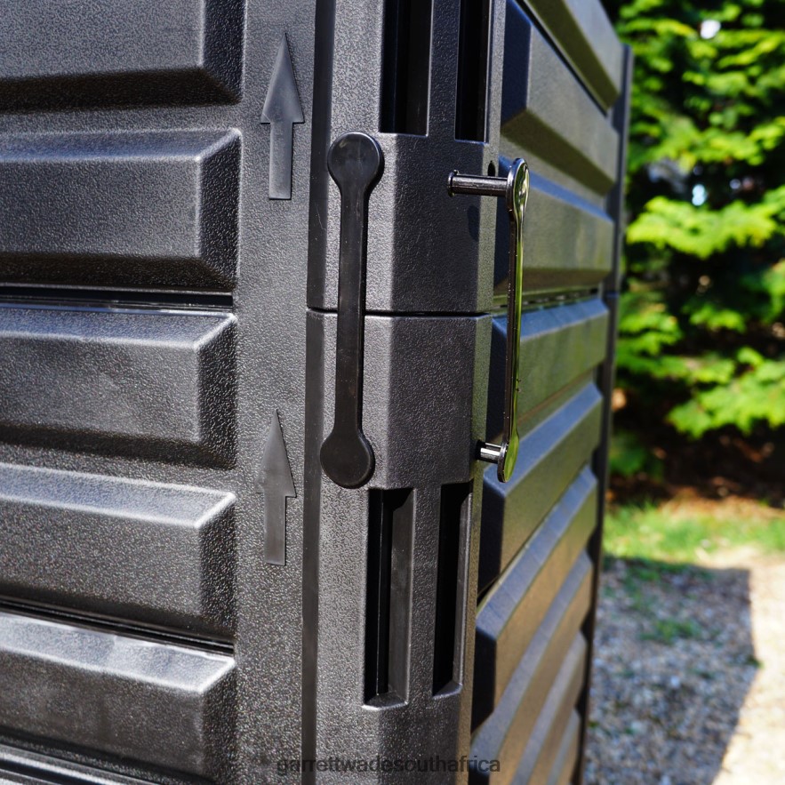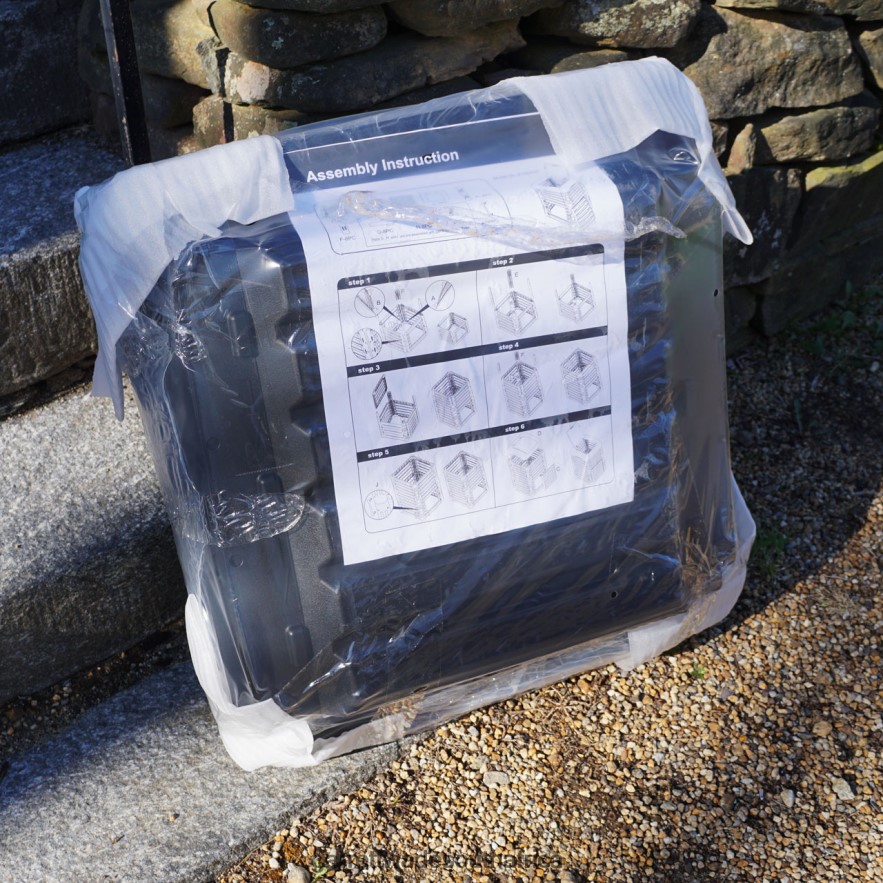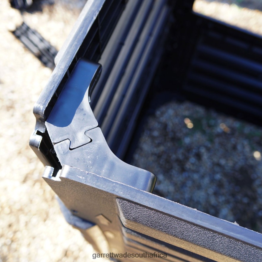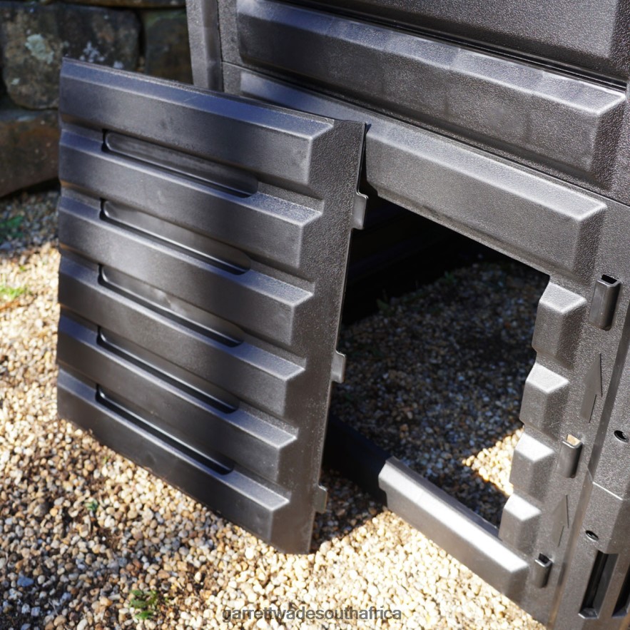 Turn your (non-meat or dairy) kitchen scraps and yard refuse into super soil, full of nutrients for your garden in the form of rich, healthy compost. This composter holds a healthy 89 gallons, is easy to assemble, with no tools required, and won't strain your back with tumbling and turning. Just load through the top, use a gardening fork to aerate from time to time, and after 4-6 weeks beautiful compost can be retrieved out either bottom door. The large top lid locks to deter pests but stays securely open while loading and aerating. It's also made from 90% recycled materials, further reducing your environmental impact. The unique design allows for airflow, while the tough black plastic absorbs and retains heat; both are essential for accelerating the composting process. Dimensions: 25'' L x 25.6'' W x 39.4'' H, with 12.5 cubic feet capacity. Weight 30 lbs